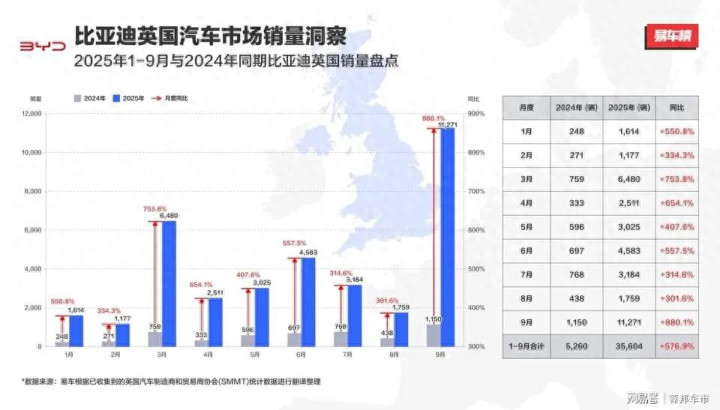 2025年9月,比亚迪在英国市场的乘用车销量达到了11271辆,同比增长880%,环比增长541%。今年前九个月,比亚迪汽车在英累计销量达到35604辆,同比增长576.9%,全市场销量超越了特斯拉、Mini等一众知名汽车品牌同期在英国的销量。
